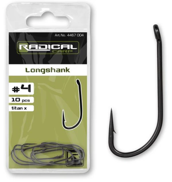 De Radical Longshank Titan X Haken zijn haken met een langstelige haakvorm met een uitstekende kwaliteit en scherpte. De langstelige vorm zorgt voor een snelle inhaking, ideaal voor korte hairs. De speciale matte coating voorkomt reflecties en beschermt de haken tegen de elementen. De haken zijn niet alleen zeer scherp maar zullen ook langer scherp blijven dan vergelijkbare modellen waardoor de haken langer effectief zijn!