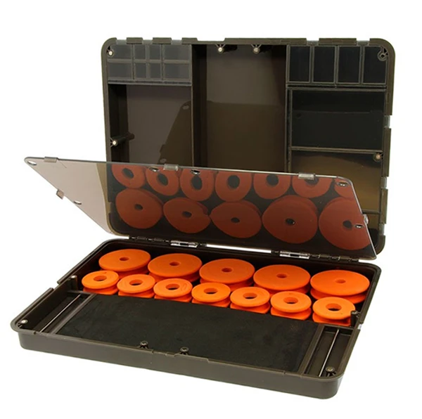 De nieuwe NGT Dynamic tacklebox is een one-stop karper-opbergsysteem dat ideaal is voor het opbergen van rigs, onderlijnmateriaal en zelfs grotere items zoals scharen en voernaalden. De donkergroene tacklebox wordt beveiligd door zes magneten en een transparante interne verdeler. Aan de ene kant is de box ingedeeld voor rigs, met een EVA-rigbord dat plaats biedt aan ongeveer 20 opgemaakte hair-rigs, en zeven kleine en vijf grote oranje EVA-winders. De andere zijde bevat 26 opbergvakken in verschillende formaten (ideaal voor kleine materiaal) plus twee grotere open opbergruimtes. De deksel is voorzien van een meetlint, perfect hulpmiddel om de lengte van je rigs te bepalen.